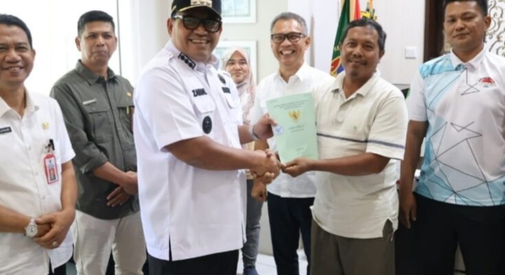 PENAJAM PASER UTARA- Penjabat (Pj) Bupati Penajam Paser Utara (PPU), Zainal Arifin menyerahkan secara simbolis sertifikat tanah kepada 20 orang petambak asal kelurahan Maridan, kecamatan Sepaku, kabupaten PPU di Kantor Agraria Tata Ruang (ATR) Badan Pertanahan Nasional (BPN) kabupaten PPU.