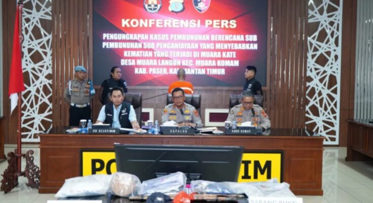 BALIKPAPAN – Kepolisian Daerah Kalimantan Timur menggelar konferensi pers kasus pembunuhan berencana yang terjadi di Muara Kate, Kecamatan Muara Komam, Kabupaten Paser. Dua orang menjadi korban dalam kejadian ini, satu orang meninggal dunia dan lainnya mengalami luka berat, Selasa (22/7/2025).
