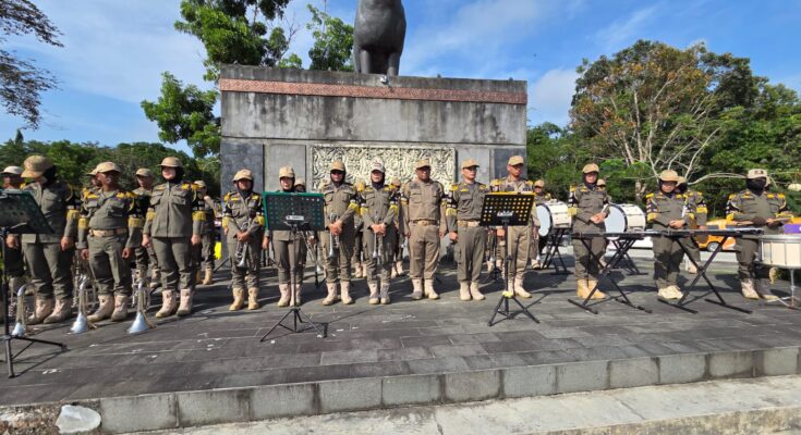 PENAJAM — Upacara peringatan Hari Kesaktian Pancasila Tahun 2025 yang digelar di Halaman Kantor Bupati Penajam Paser Utara pada Rabu (01/10/2025) berlangsung dengan penuh khidmat. Salah satu unsur penting yang menambah kekhidmatan jalannya upacara adalah kehadiran Korps Musik Gita Praja Wibawa Satuan Polisi Pamong Praja (Satpol PP) Kabupaten PPU yang bertugas mengiringi rangkaian acara.